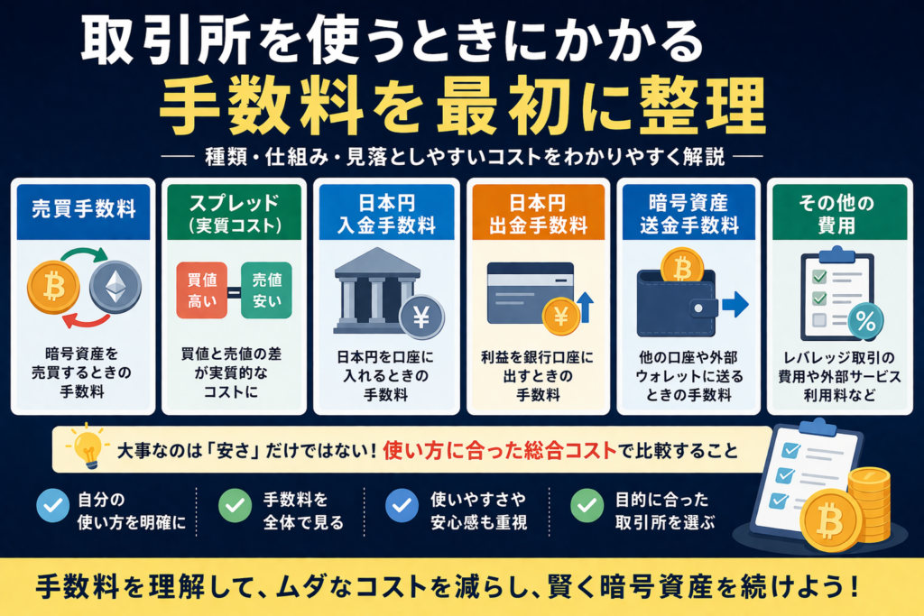 売買手数料だけを見るのでは足りません。スプレッド、日本円の入出金、暗号資産の送金まで含めて見ていくことで、初めて本当のコストが見えてきます。