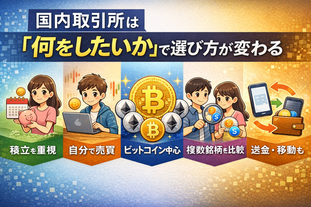この記事では、国内取引所を「目的別」で整理しながら、どんな人にどんな選び方が合いやすいのかを順番にまとめます。