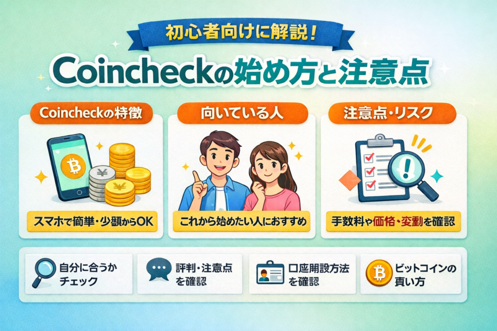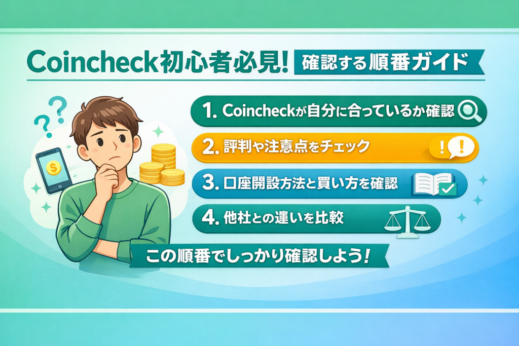 このページでは、Coincheckの基本的な特徴を整理しながら、どんな人に向いているのか、使う前に知っておきたい注意点は何か、どこから確認すればいいのかを順番にまとめていきます。