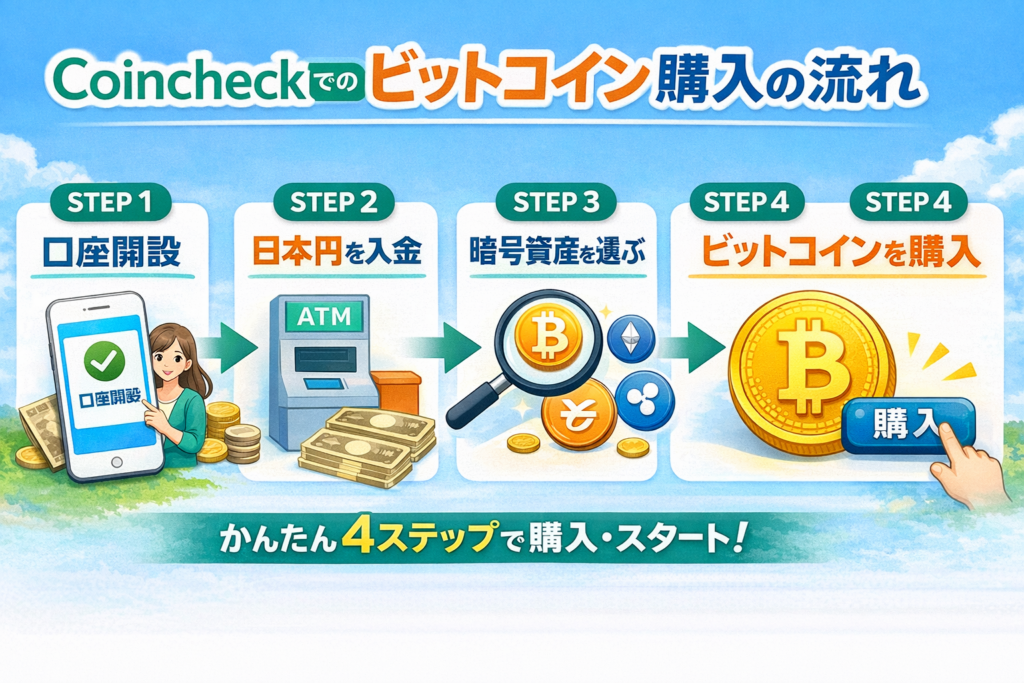 ※本記事には広告・PRを含みます。 Coincheckで口座開設を終えたあと、多くの人が次に気になるのは「実際にどうやってビットコインを買うのか」という部分です。 口座を作るところまでは進めても、その ...